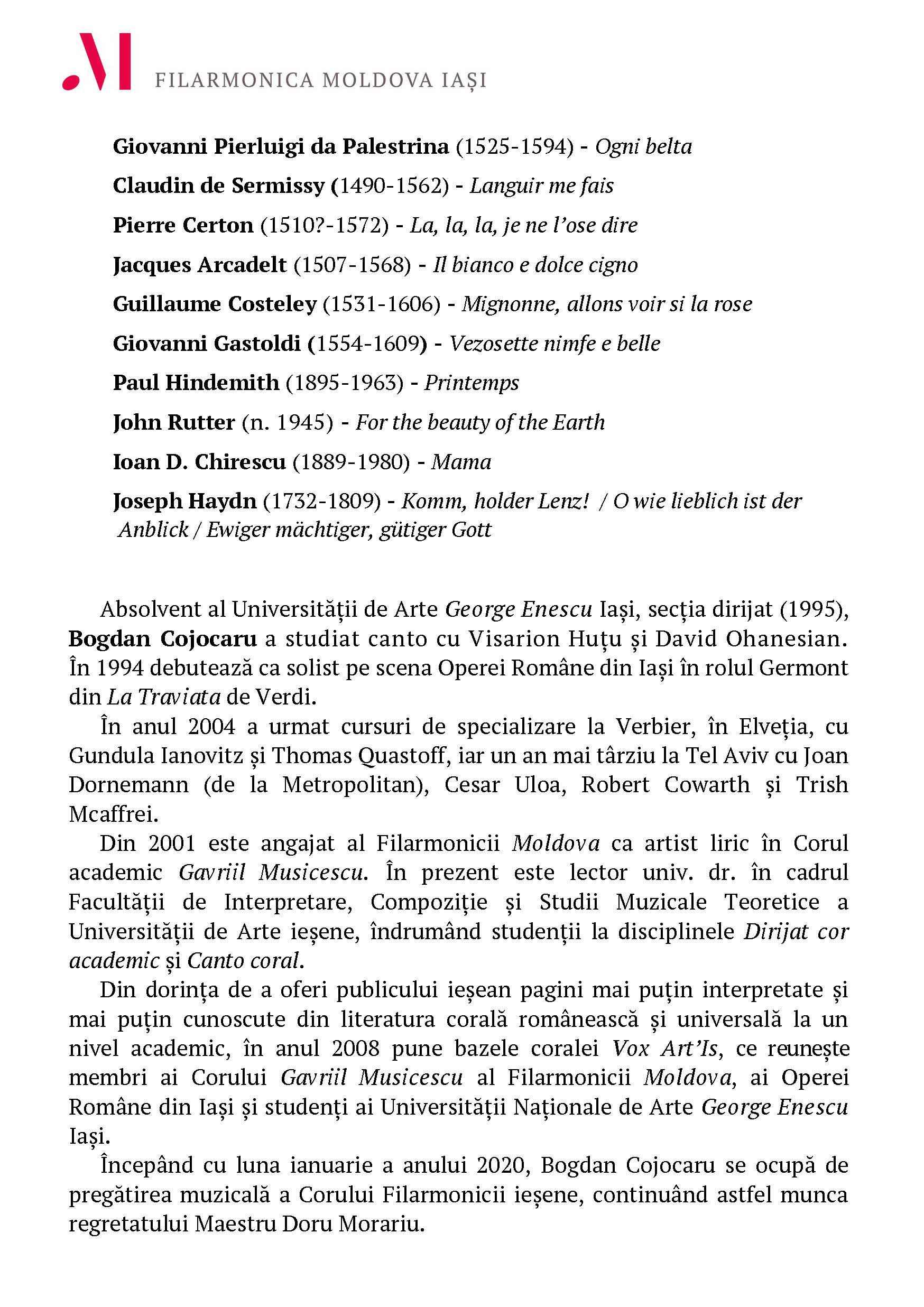 Lucrări de: P. da Palestrina, C. de Sermissy, P. Certon, J. Arcadelt, G. Costeley, G. Gastoldi, P. Hindemith, J. Rutter, I. D. Chirescu, J. Haydn.