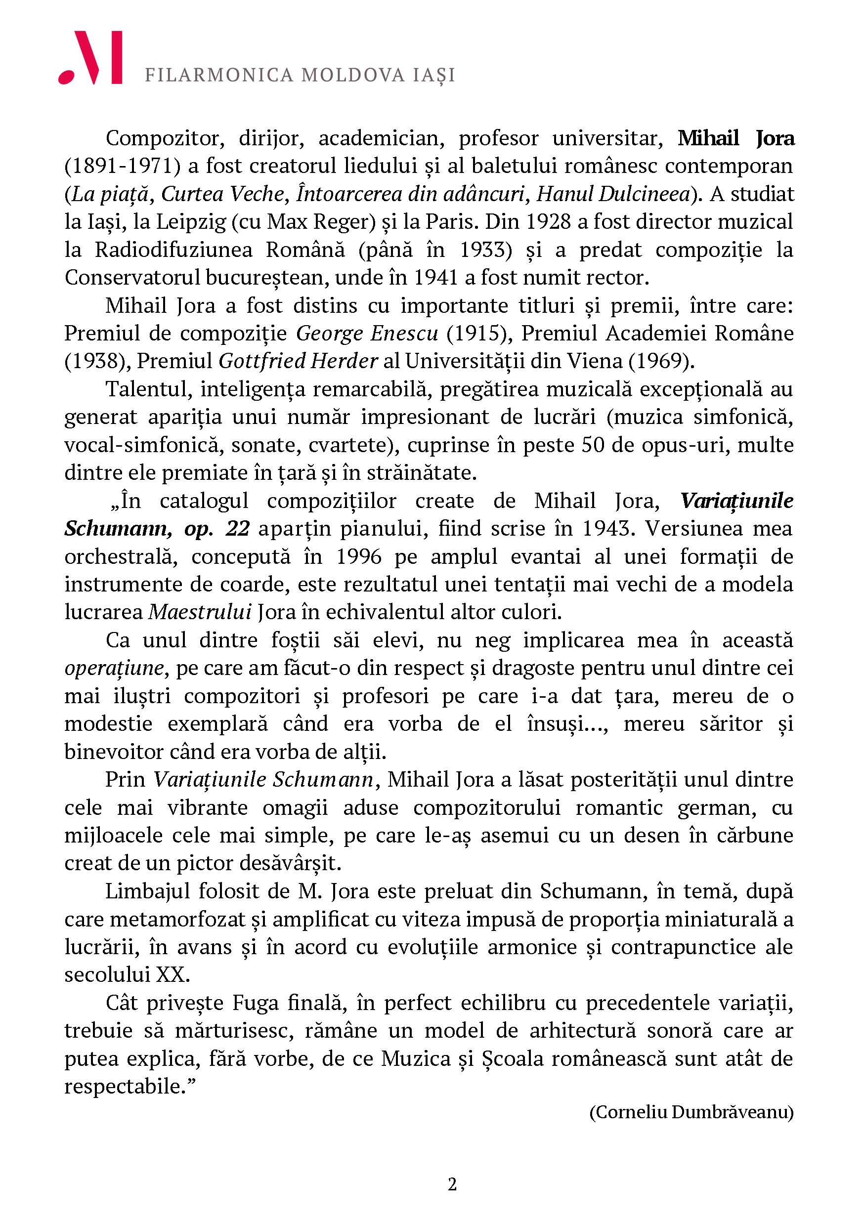 Mihail Jora – Variațiuni pe o temă de Schumann op. 22 – versiune pentru orchestră de coarde de Corneliu Dumbrăveanu