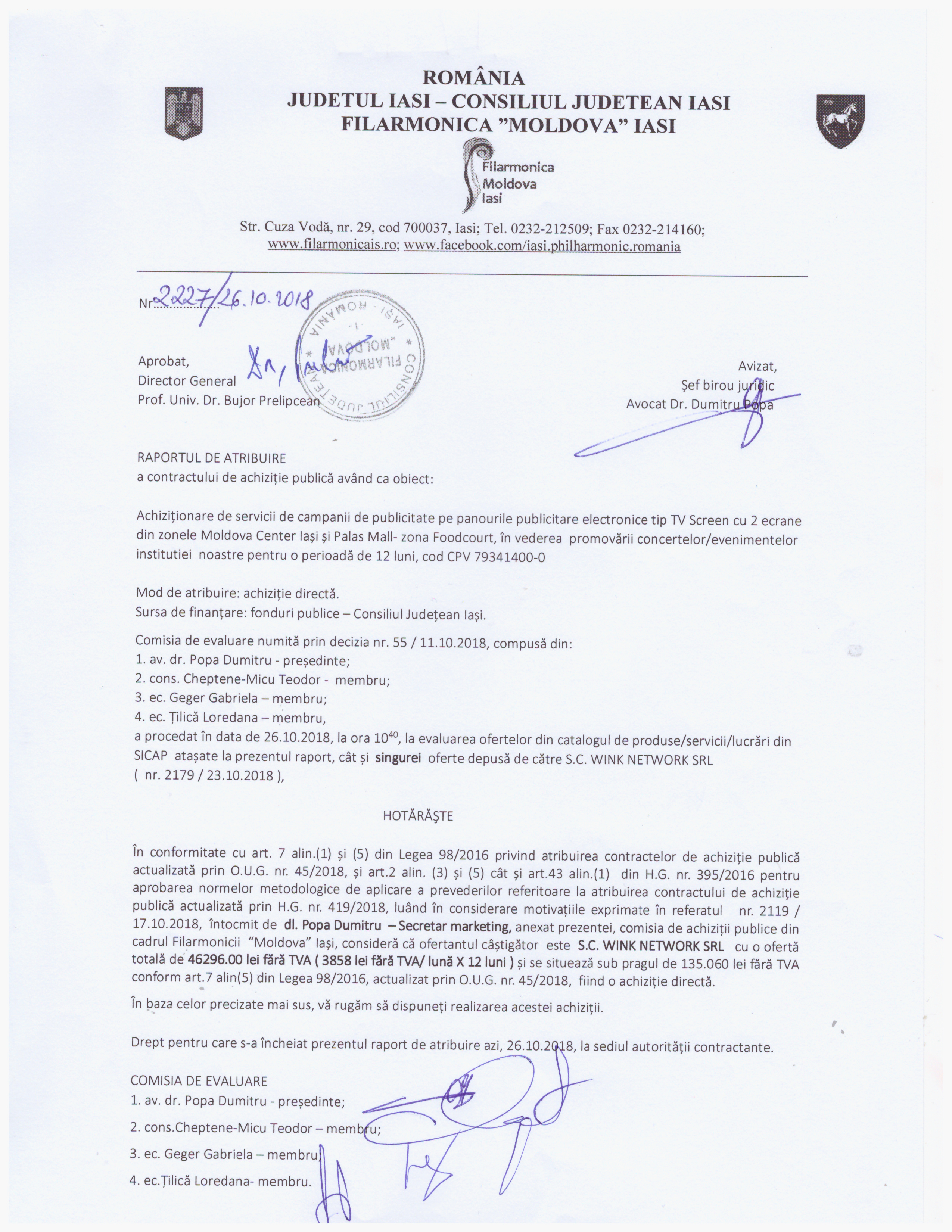 Filarmonica Moldova Iasi achizitioneaza servicii de campanii de publicitate pe panourile publicitare electronice tip TV Screen cu 2 ecrane din zonele Moldova Center Iasi - o fata spre Consiliul Judetean Iasi/Palat si o fata spre Directia de Finante Publice Iasi/ Hotel Hampton Hilton ( fost Europa ) si Palas Mall-zona FOODCOURT, in vederea promovarii concertelor/evenimentelor institutiei noastre pentru o perioada de 12 luni. Ofertele trebuiesc postate si in SICAP.