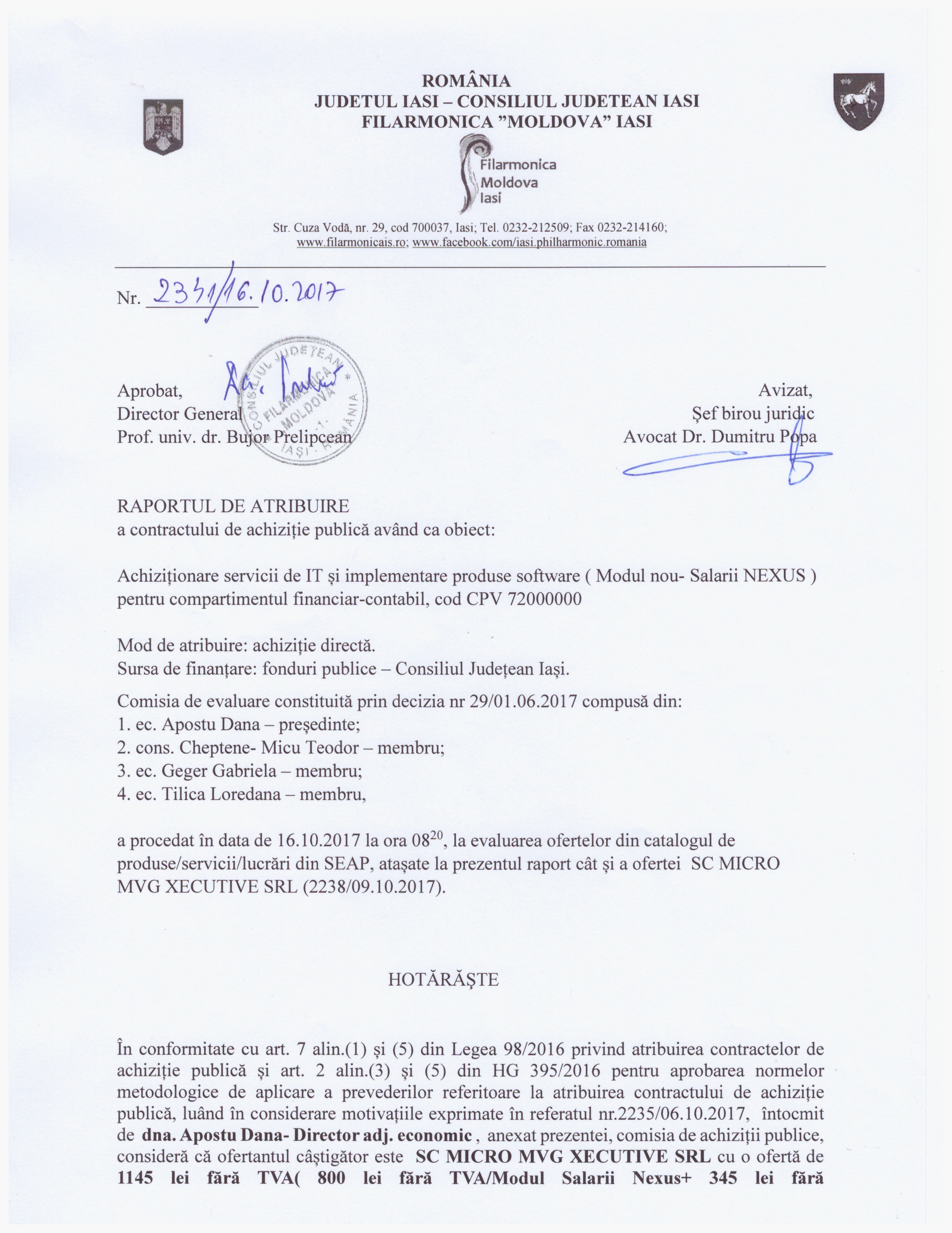 Filarmonica Moldova Iasi achizitioneaza servicii IT- produse software- Modul Salarii NEXUS pentru compartimentul financiar-contabil.